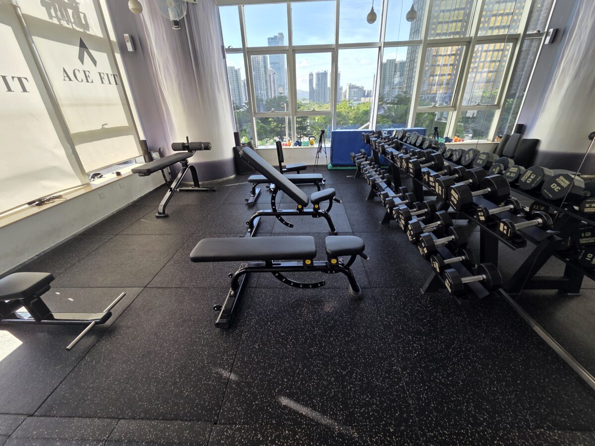 프리웨이트 공간. 덤벨과 벤치를 보면 본격 헬스장이다. 본격 월 회원권 헬스장 답다.